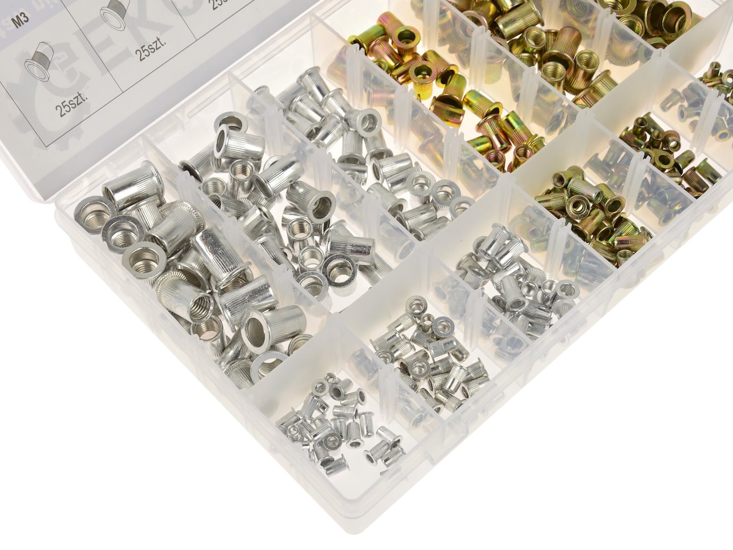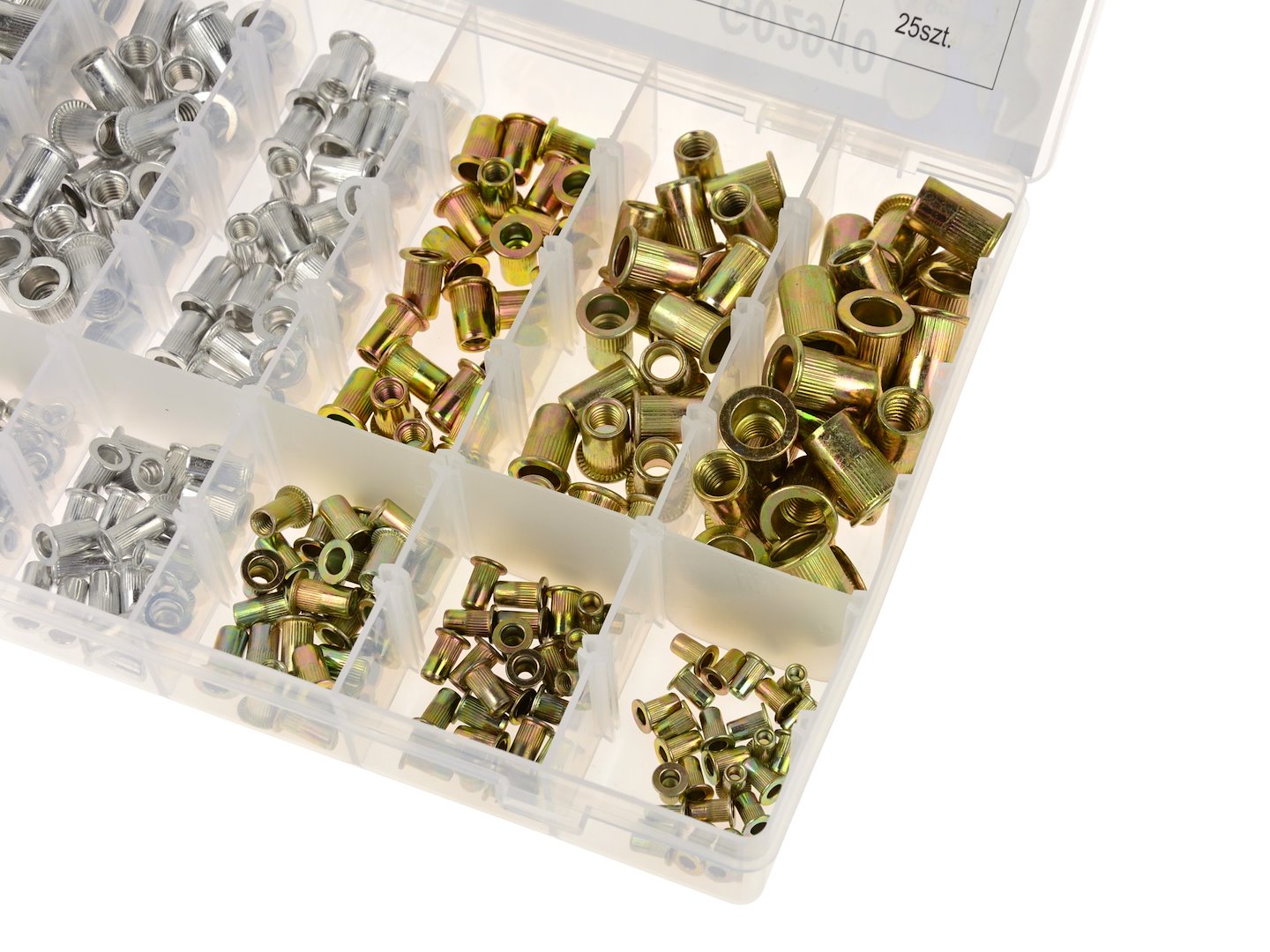 Zestaw obejmuje rozmiary od M3 do M10, więc sprawdzi się zarówno w precyzyjnych montażach, jak i przy większych obciążeniach, a każdy rozmiar występuje po 25 sztuk w wersji stalowej i aluminiowej, co zapewnia równowagę i szerokie możliwości w codziennej pracy.