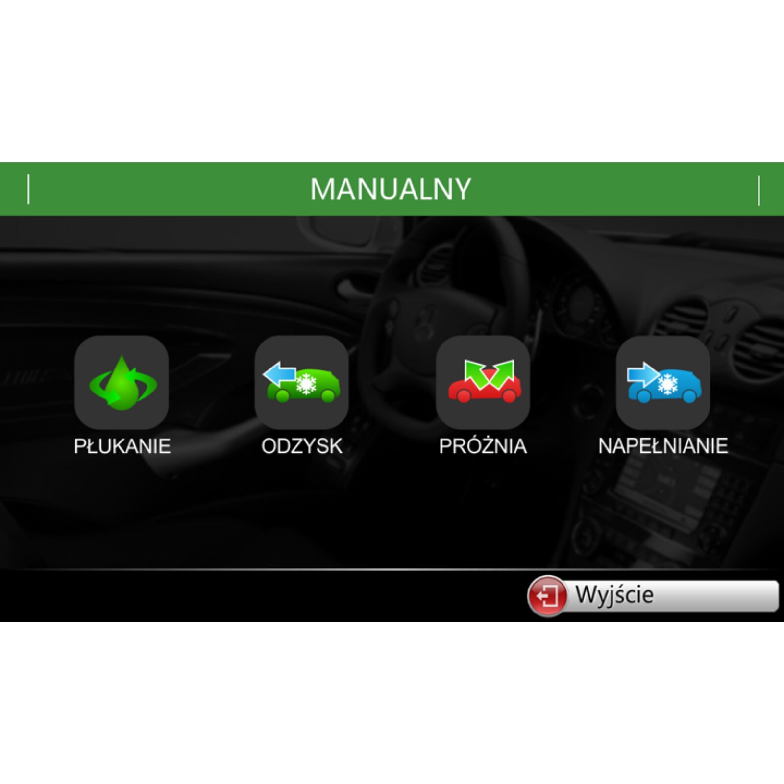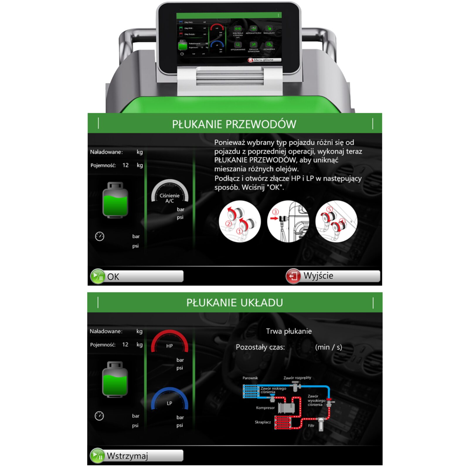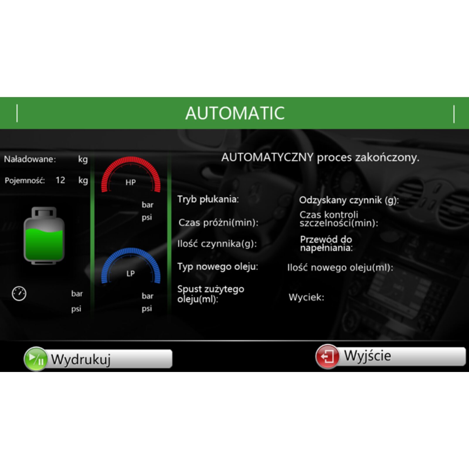 Pełna Automatyzacja: Cykl: Płukanie + Odzysk + Próżnia + Szczelność + Olej + Napełnianie odbywa się bez ingerencji operatora.