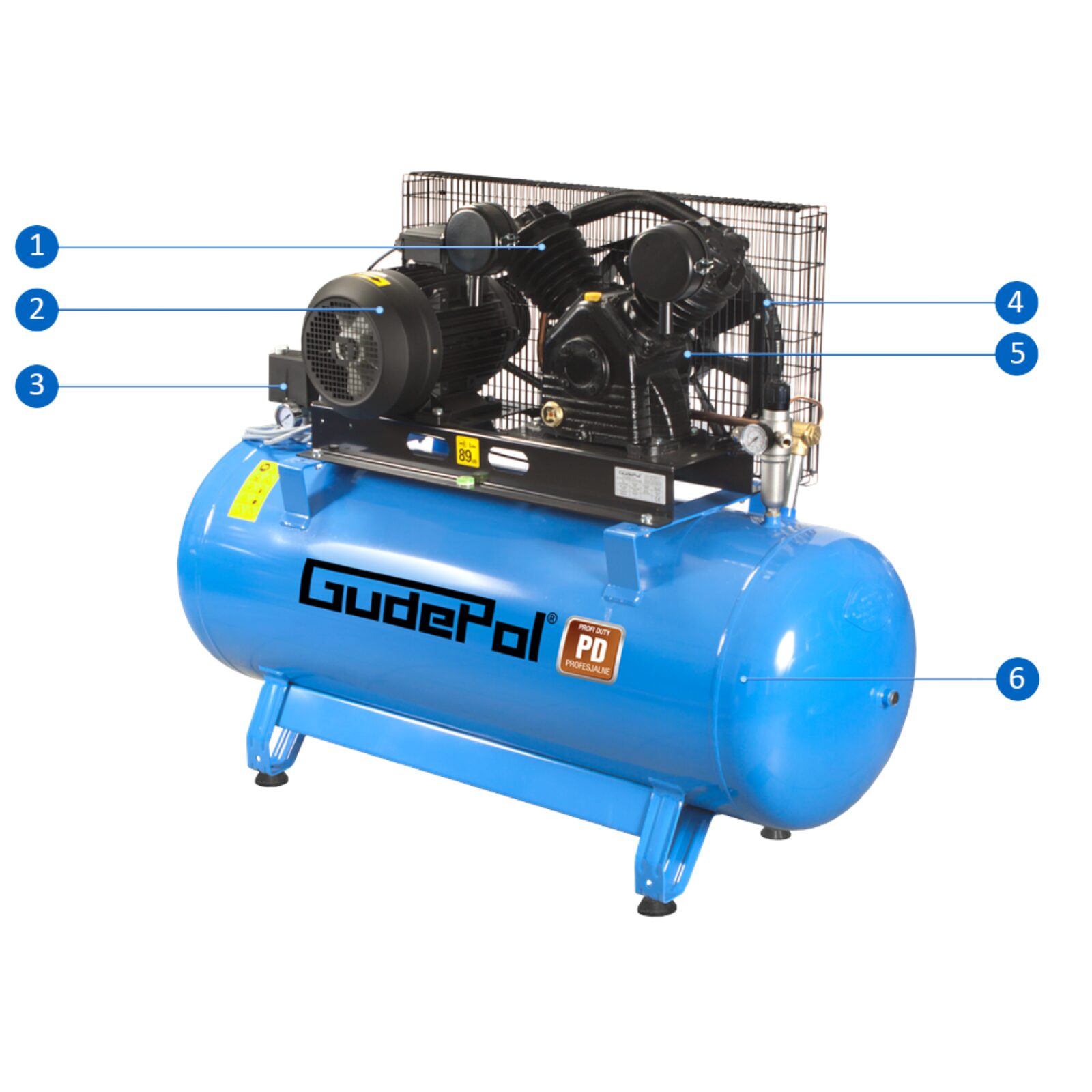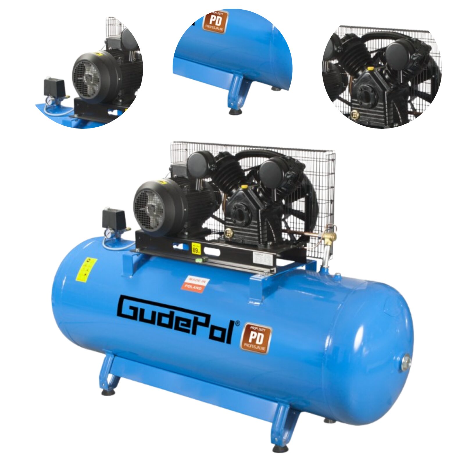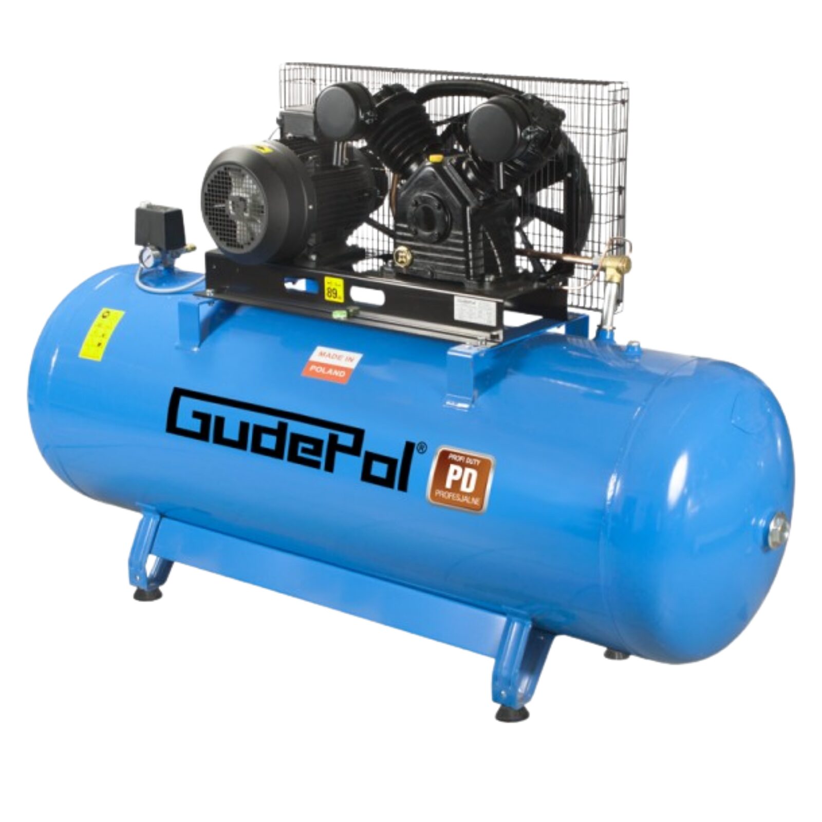 GUDEPOL to polski lider pneumatyki działający nieprzerwanie od 1990 roku. Seria PD to profesjonalne rozwiązanie łączące potężny system pompujący z ogromnym zbiornikiem malowanym proszkowo. Sprężarka została w całości zaprojektowana i zmontowana w Polsce, co gwarantuje najwyższą jakość wykonania oraz niezawodność przy najbardziej intensywnych obciążeniach przemysłowych.