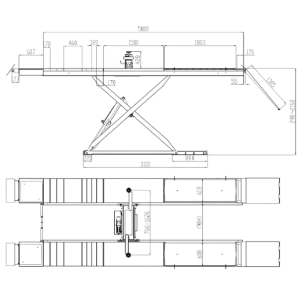 Model przystosowany jest do montażu w posadzce (w fosie) lub bezpośrednio na posadzce, co pozwala dopasować instalację do układu stanowiska pracy. Udźwig 5000 kg umożliwia bezpieczną obsługę samochodów osobowych oraz dostawczych.