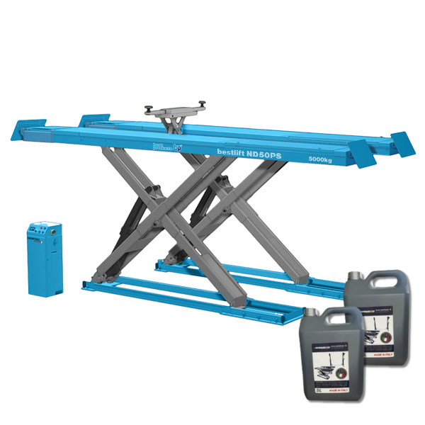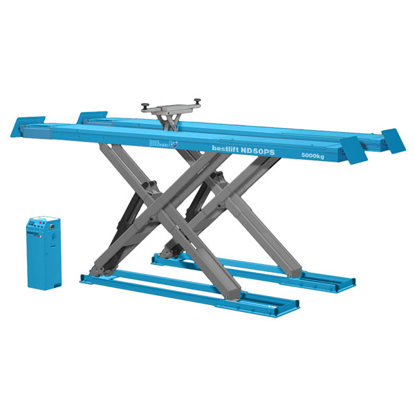 Bestlift ND50PS to profesjonalny podnośnik nożycowy 5.0T z szarpakiem, zaprojektowany do precyzyjnego ustawiania geometrii kół oraz diagnostyki zawieszenia. Urządzenie zostało wyposażone w hydrauliczny dźwignik osi zasilany pneumatycznie oraz system zabezpieczeń spełniający wymagania nowoczesnych warsztatów samochodowych.
